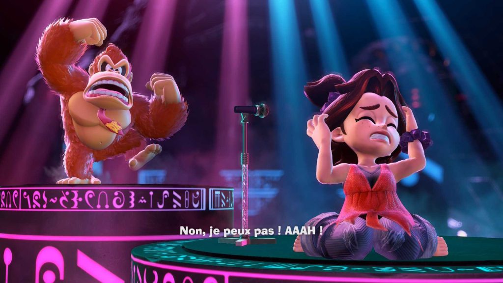 En termes de subtilité de gameplay, nous préférons largement l’aide fournie par la précieuse partenaire de DK : Pauline ! Déjà présente dans Super Mario Odyssey, Nintendo n’a pas oublié le personnage féminin et la présente ici comme une adolescente, donc bien avant sa carrière de chanteuse à New Donk City. Par ses encouragements et ses chants, la jeune fille peut transformer notre héros poilu en véritable machine de guerre ! En autruche, les joueurs pourront voler, tandis qu’en zèbre, ils pourront accélérer. C’est drôle tout en étant très fun.