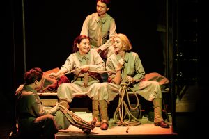 Dès les premières secondes, le ton est donné : rythme soutenu, mise en scène mobile et fluide, plateau vivant, transformé par une scénographie ingénieuse par une structure métallique centrale qui devient navire, désert, baraquement ou plage de Normandie. Le travail sur la lumière et le son renforce intensément l’immersion. On est dans du théâtre spectaculaire, non sans une pointe d’humour, et plongé en pleine immersion dans cette histoire digne des plus grands récits de guerres. Le spectateur aussi va ressentir l’attente, l’enthousiasme, la peur, le deuil, la camaraderie auprès de toutes ses femmes.